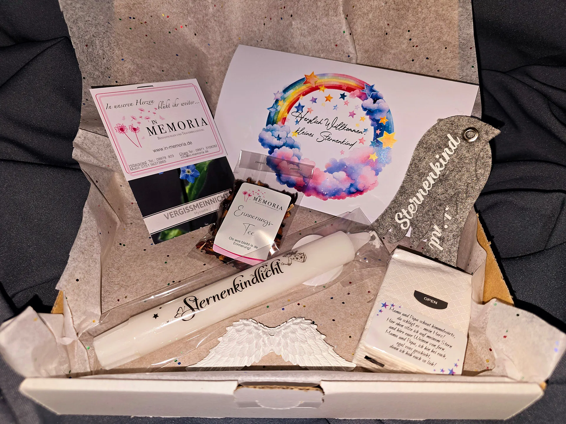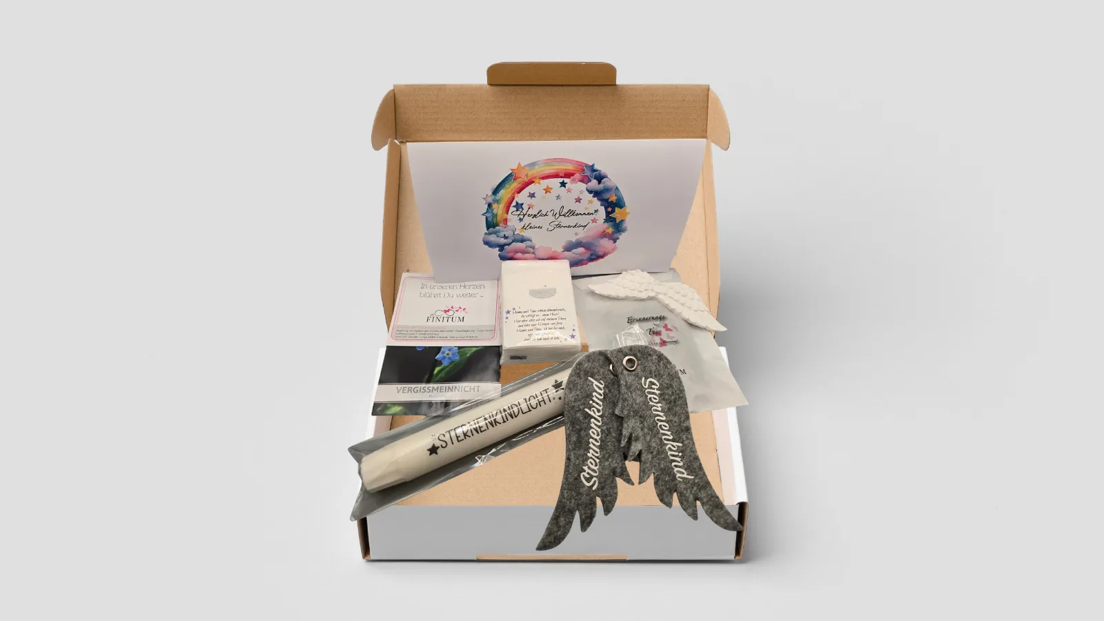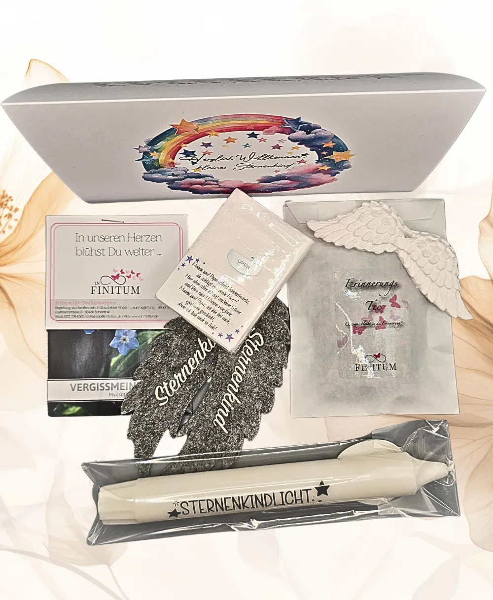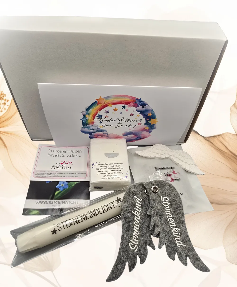 Unsere kostenfreie Trostbox beinhaltet liebevoll erstellte Gedenk-Artikel für ein Sternenkind sowie Info-Material über regionale Hilfsangebote im Landkreis. Der Inhalt ist neutral und einheitlich, und auch Kliniken, Praxen und Fachpersonal können Boxen erhalten.