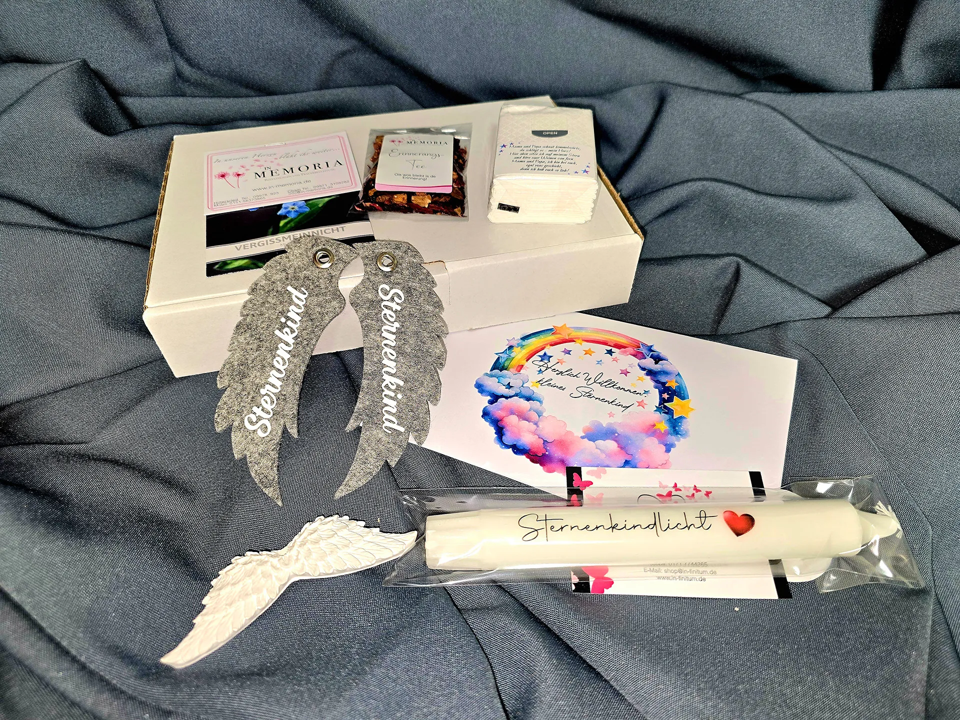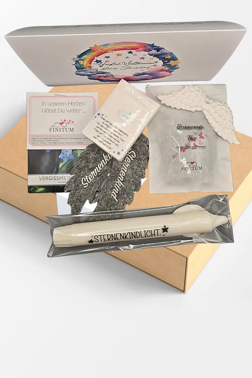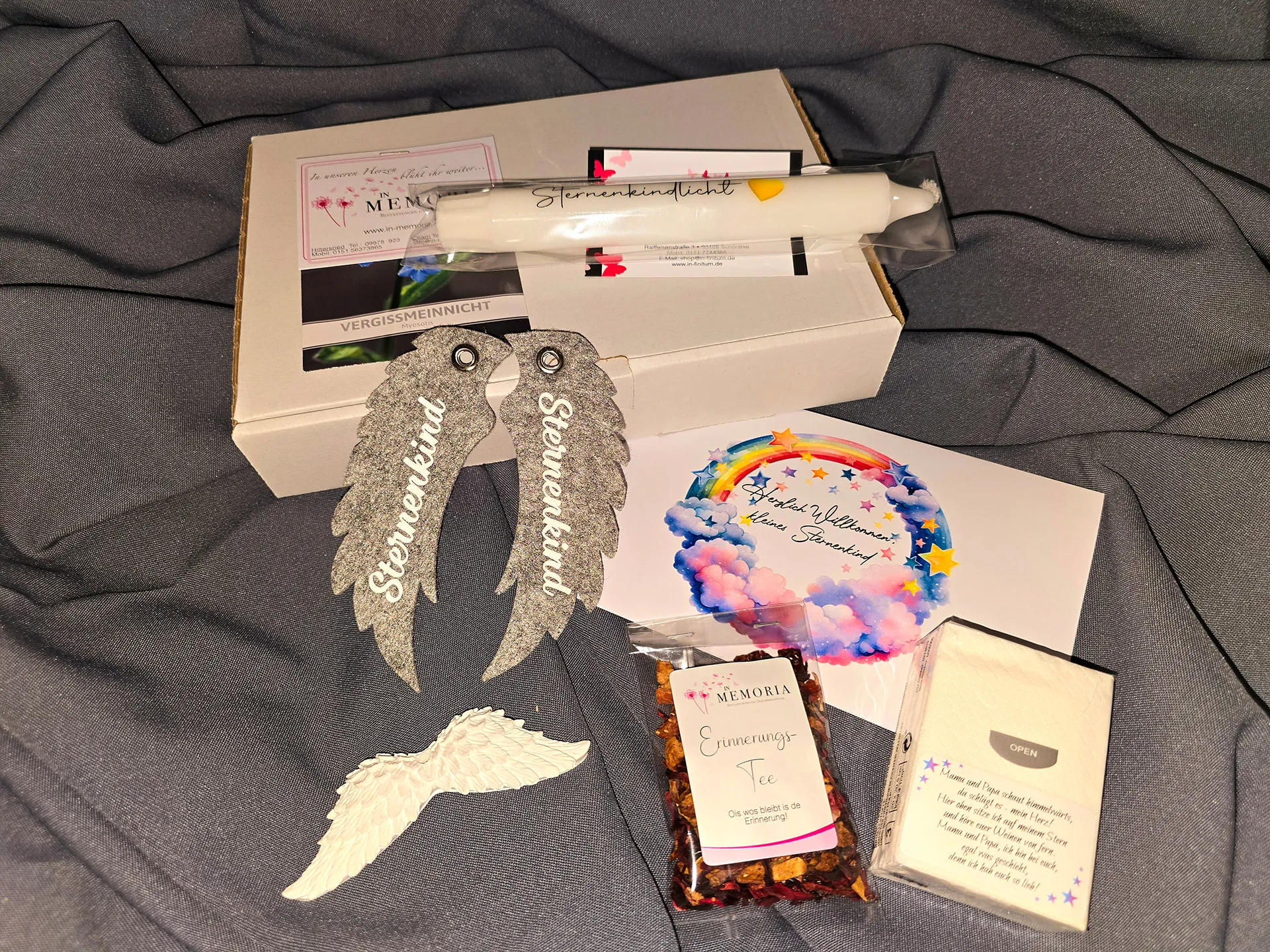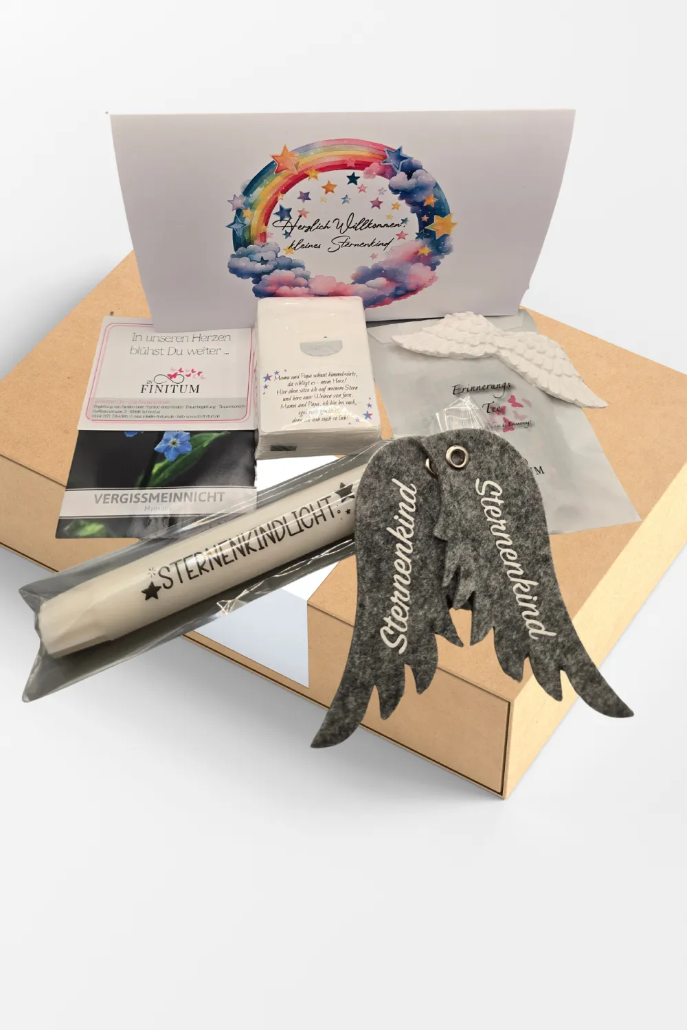 Unsere kostenfreie Trostbox beinhaltet liebevoll erstellte Gedenk-Artikel für ein Sternenkind sowie Info-Material über regionale Hilfsangebote im Landkreis. Der Inhalt ist neutral und einheitlich, und auch Kliniken, Praxen und Fachpersonal können Boxen erhalten.